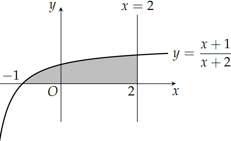 Diện tích hình phẳng được giới hạn bởi đồ thị hàm số \(y=\dfrac{x+1}{x+2}\), trục hoành và đường thẳng \(x=2\) là