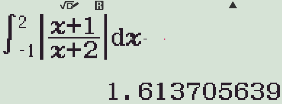 \displaystyle S&=\,\int\limits_{-1}^2\left|\dfrac{x+1}{x+2}\right|\mathrm{\,d}x=\int\limits_{-1}^2\dfrac{x+1}{x+2}\mathrm{\,d}x\\