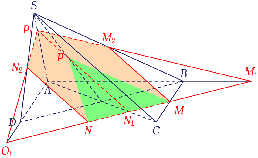 Trong mặt phẳng $(\alpha)$, cho hình bình hành $ABCD$ tâm $O$, $S$ là một điểm không thuộc $(\alpha)$. Gọi $M,\,N,\,P$ lần lượt là trung điểm của $BC$, $CD$ và $SO$. Đường thẳng $MN$ cắt $AB$, $AC$ và $AD$ tại $M_1$, $N_1$ và $O_1$. Nối $N_1P$ cắt $SA$ tại $P_1$, nối $M_1P_1$ cắt $SB$ tại $M_2$, nối $O_1P_1$ cắt $SD$ tại $N_2$. Khi đó giao tuyến của $(MNP)$ với $(SAB)$ là