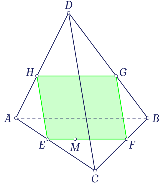 Lại vì $(\alpha)\parallel CD$ nên $(\alpha)\cap(ACD)=EH$ sao cho $EH\parallel CD$ và $(\alpha)\cap(BCD)=FG$ sao cho $FG\parallel CD$.