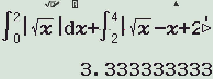&=\displaystyle\int\limits_0^2\left|\sqrt{x}-0\right|\mathrm{\,d}x+\displaystyle\int\limits_2^4\left|\sqrt{x}-(x-2)\right|\mathrm{\,d}x\\