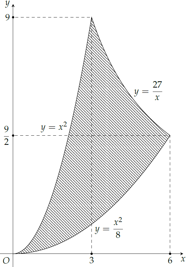 &=&\displaystyle\int\limits_0^3\left(x^2-\dfrac{x^2}{8}\right)\mathrm{\,d}x+\displaystyle\int\limits_3^6\left(\dfrac{27}{x}-\dfrac{x^2}{8}\right)\mathrm{\,d}x\\
