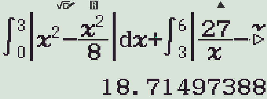 &=&\displaystyle\int\limits_0^3\left|x^2-\dfrac{x^2}{8}\right|\mathrm{\,d}x+\displaystyle\int\limits_3^6\left|\dfrac{27}{x}-\dfrac{x^2}{8}\right|\mathrm{\,d}x\\