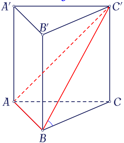 Cho hình lăng trụ đứng $ABC.A'B'C'$ có đáy $ABC$ là tam giác vuông tại $B$, $AC=2$, $AB=\sqrt{3}$ và $AA'=1$ (tham khảo hình bên).