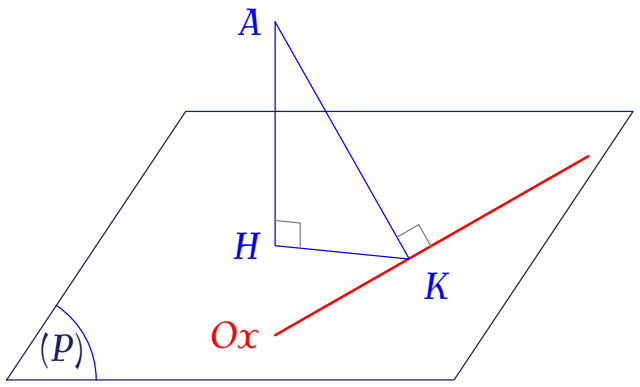 Do đó, khoảng cách từ $A$ đến $(P)$ lớn nhất khi $H\equiv K$, tức là $AK\perp(P)$.