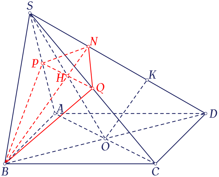 Gọi $O,\,K,\,H$ lần lượt là trung điểm $BD$, $ND$, $SO$