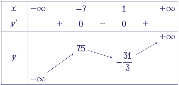Ta có $y'=x^2+6x-7$. Cho $y'=0\Leftrightarrow\left[\begin{array}{l}x=1\\ x=-7.\end{array}\right.$