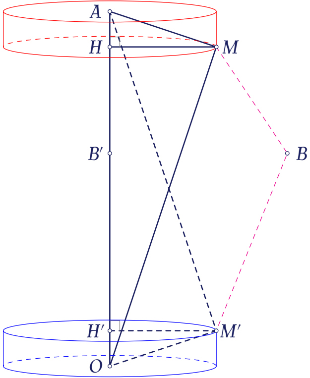 Vậy $M$ thuộc mặt trụ có trục $AH$ hoặc mặt trụ có trục $OH'$, trong đó $OH'=1$ (như hình).