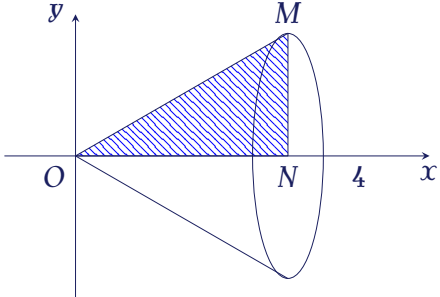 Gọi $V_1$ là thể tích khối tròn xoay tạo thành khi quay tam giác $OMH$ quanh trục $Ox$. Biết rằng $V=2V_1$. Khi đó