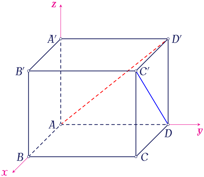 Ta có $A(0;0;0)$, $D(0;2;0)$, $D'(0;2;2)$, $C'(1;2;2)$. Khi đó $\overrightarrow{AD'}=(0;2;2)$, $\overrightarrow{DC'}=(1;0;2)$, $\overrightarrow{AD}=(0;2;0)$.