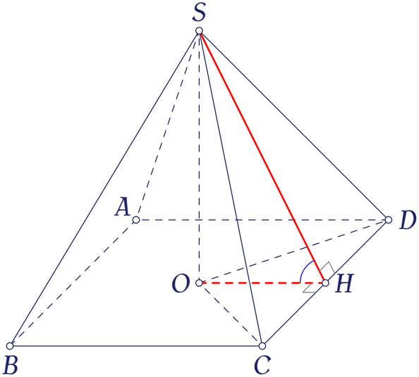 Gọi $O$ là tâm mặt đáy, $H$ là trung điểm cạnh $CD$.