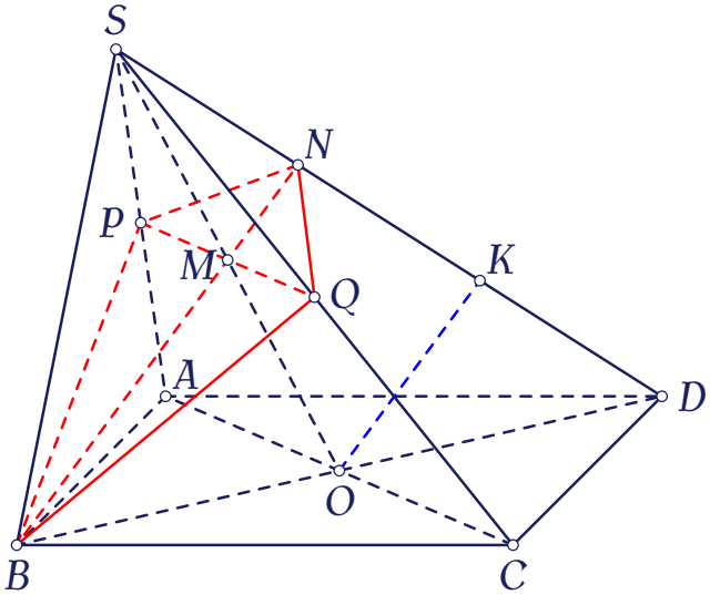 Gọi $K$ là trung điểm của đoạn thẳng $ND$. Khi đó, $OK$ là đường trung bình của tam giác $BND$. Từ đó suy ra $MN$ cũng là đường trung bình của tam giác $SOK$.