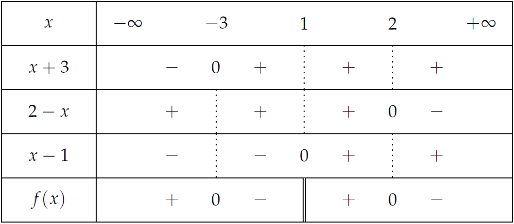 Theo đó, \(f(x)>0\Leftrightarrow x\in(-\infty;-3)\cup(1;2)\).