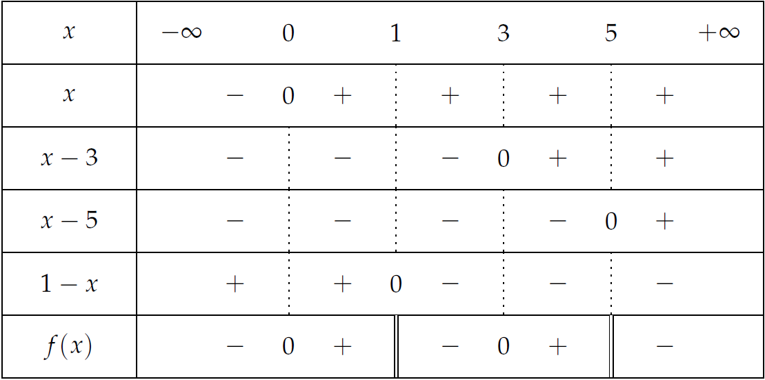 Theo đó, \(f(x)\geq0\Leftrightarrow x\in[0;1)\cup[3;5)\).