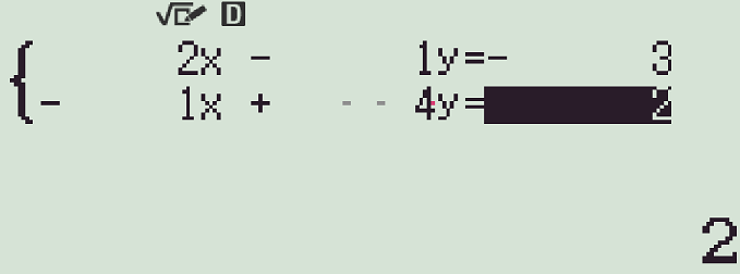\(\begin{align*}\begin{cases}2x-y+3&=0\\ -x+4y&=2\end{cases}\Leftrightarrow&\begin{cases}2x-y&=-3\\ -x+4y&=2\end{cases}\\