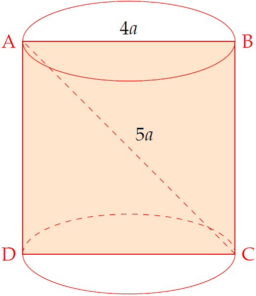Cắt một khối trụ bởi một mặt phẳng qua trục ta được thiết diện là hình chữ nhật \(ABCD\) có \(AB\) và \(CD\) thuộc hai đáy của hình trụ, biết \(AB=4a\), \(AC=5a\). Tính thể tích của khối trụ.