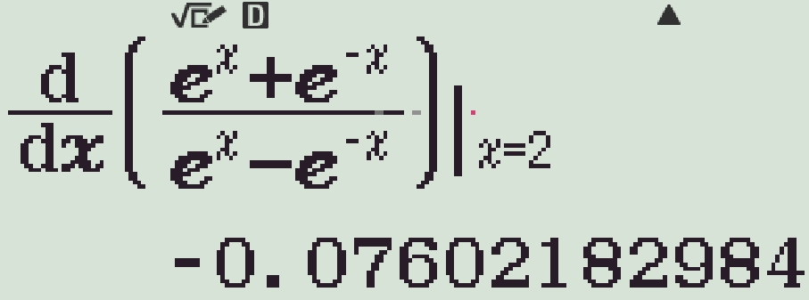 | \(y'=\dfrac{\mathrm{e}^x}{\left(\mathrm{e}^x-\mathrm{e}^{-x}\right)^2}\) | |